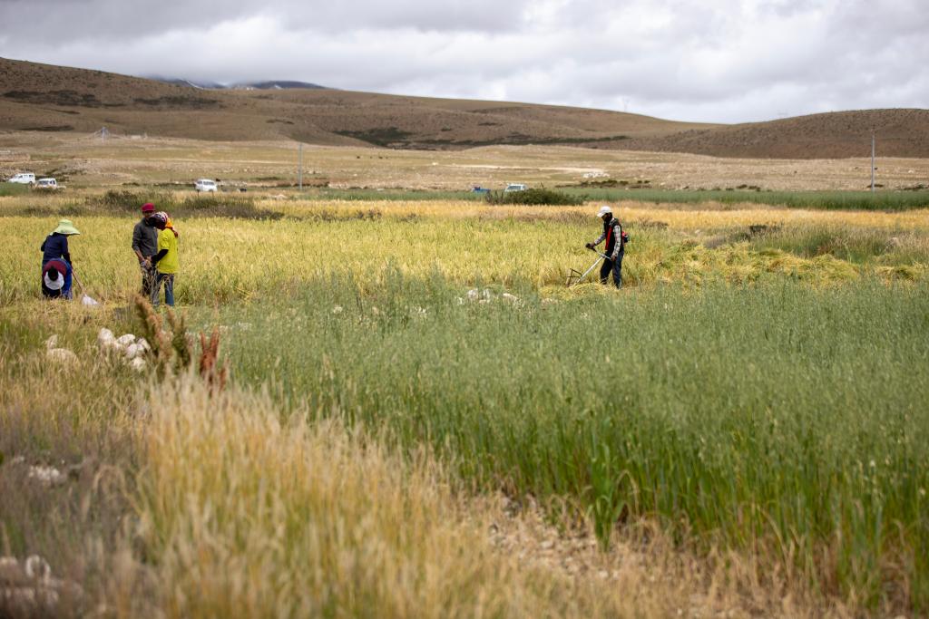 西藏当雄县羊八井镇甲玛村村民收割饲草,为牲畜越冬做准备