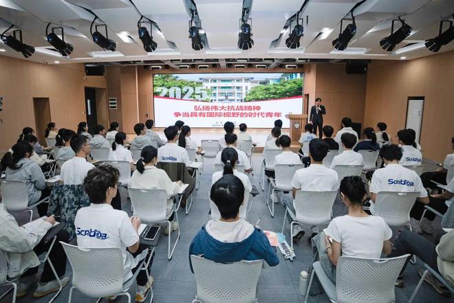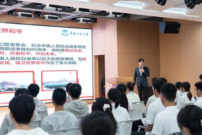 11月26日上午,中国工程院院士、校党委副书记、校长杨中民在佛山校区南海校园以“弘扬伟大抗战精神,争当具有国际视野的时代青年”为题,讲授2025年秋季学期“思政第一课”。课程从“时空”和“空间”两个维度,围绕“怎样看历史”“怎样看世界”“怎样看校区”“怎样看未来”四个方面展开,引导华师学子在回望历史中汲取力量,在面向世界中开拓视野,在立足当下中锤炼本领。来自佛山校区约50名学生代表到场听课。