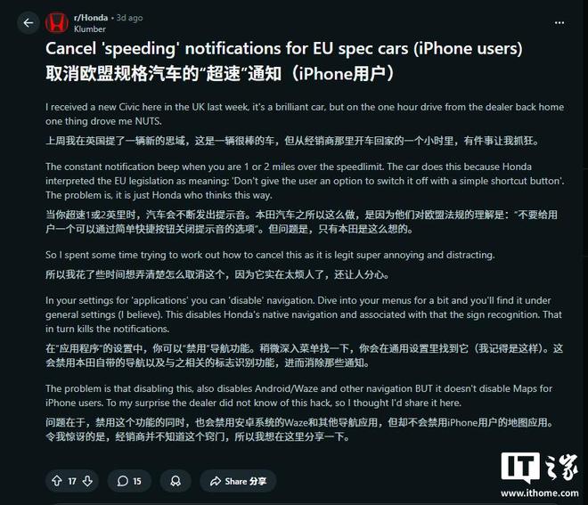 英国一位2025款改款思域车主在社交论坛Reddit吐槽,从经销商门店到家仅一小时车程,就因警报声频繁响起而倍感折磨。不同车型关闭ISA的操作差异较大:2024款未改款车型可通过车辆设置菜单关闭交通标志识别功能,但每次启动车辆都需重复操作;2025款改款车型则取消了关闭权限,仅对部分iPhone用户可通过关闭本田自带导航应用间接关闭,但代价是Android Auto和WAZE等第三方导航同步失效。