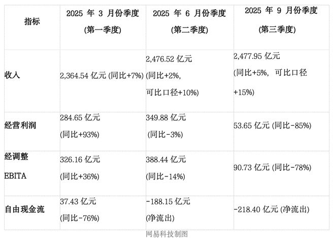 1、利润和现金流承压严重:这是最显著的变化。集团经调整EBITA利润率从2024 Q4近20%的健康水平,断崖式下滑至2025 Q3的3.7%。利润的绝对值在Q3同比暴跌78%。现金流净流出200多亿。