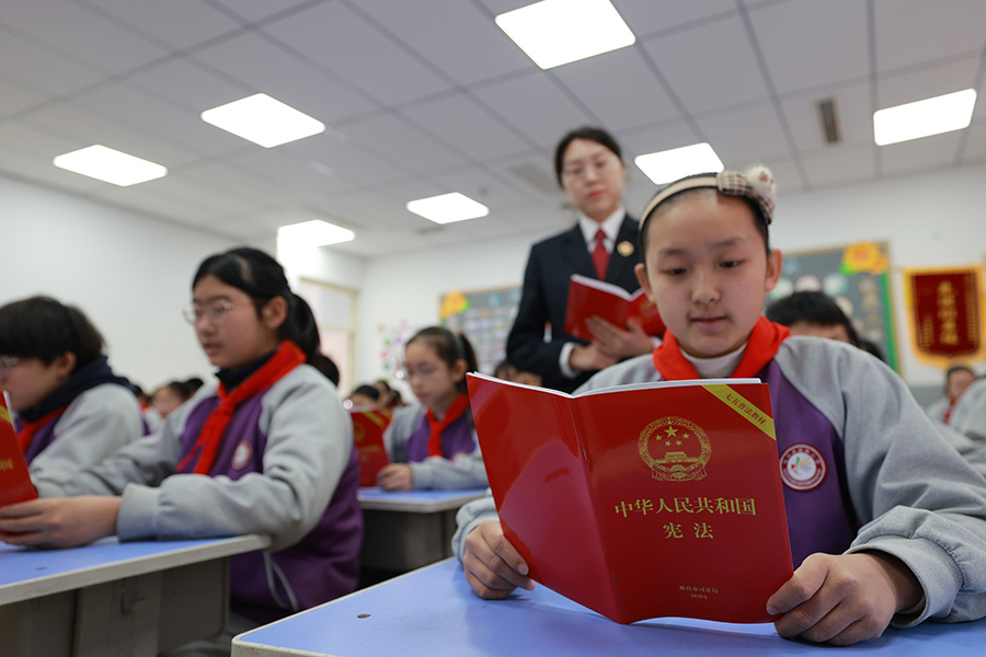 2025年12月2日,在河北省邢台市内丘县朝阳小学,内丘县人民检察院检察干警为学生讲解宪法知识。新华社发(刘继东摄)